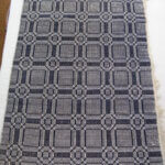 Coverlet (full sized) – Navy blue and cream color. 2 panels seamed together, three sides fringe, hemmed at top. Overshot weave, cross and table pattern, series 1B. Pattern is a large table compised of 12 small white blocks. Cotton warp and weft. Dark indigo blue wool pattern weft. Documentation: A Study in Seven Coverlet Projects, research, study and compiled by Mary Snyder 1995.