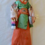 Doll-Oriental female doll, yarn hairw/topknot. Head molded with painted face. Various undergarments. Garment iglued on ornament in green , orange and peach.