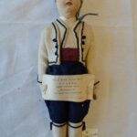 Doll- male with cloth body. Vest and Jacket wool slight insect damage., Gray cotton headdress, Navy woolen pants w / border trim, Leg ties, Painted face, red leather shoes w/ blue pompoms