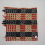 Coverlet fragment – Four colors – natural cotton warp; 3 wool wefts, dark blue, madder, light olive; one cotton weft, finer than warp. Symmetrical pattern. Overshot weave. Fringe on one side.
