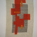 Wall hanging – linen background with black linen rectangle, orange looped design and five light orange designs over the darker color. Warp ends are finished but not hemmed.