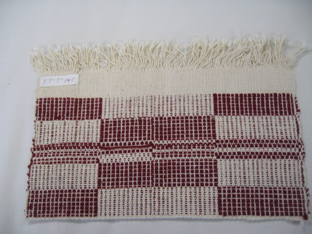 Fabric sample; dark red and white crackle weave stripe; Weave: twill-fancy.