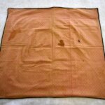 Wallhanging or tablecloth, extremely fine silk with golf motifs woven into piece herringbone border in gold and red, bound with black cotton bias strip, lined with coral lacey-woven cotton