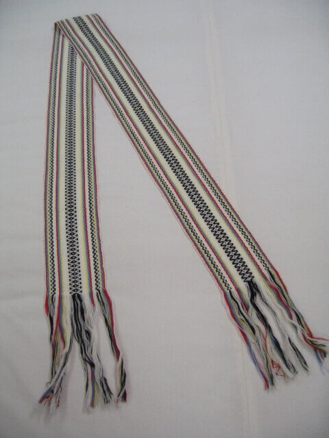 Belt – White background with figured warp stripes in, red, blue, yellow and black. Black diamond pattern in central stripe; wool; twill woven; long fringes at both warp ends.
