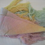 Triangular shawl in about 10 pastel colors with knotted fringe on two short sides. Plaid pattern, woven on a triangular loom.