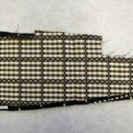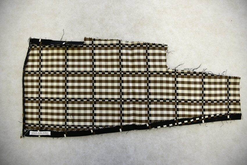 double weave yardage, 16 shafts, 4 block twill warp 1- synthetic, black, white, light brown weft 1- synthetic, black weft 2, synthetic, white light brown Commercial, part of a skirt panel, one side has large black square outlined with alternating dash-like blocks of white and brown, reverse white and brown squares