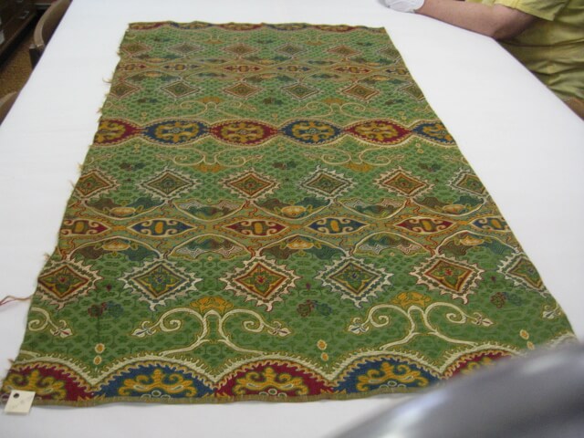 Fabric sample – brocade; green, blue, red, yellow, cream; geometric floral pattern.